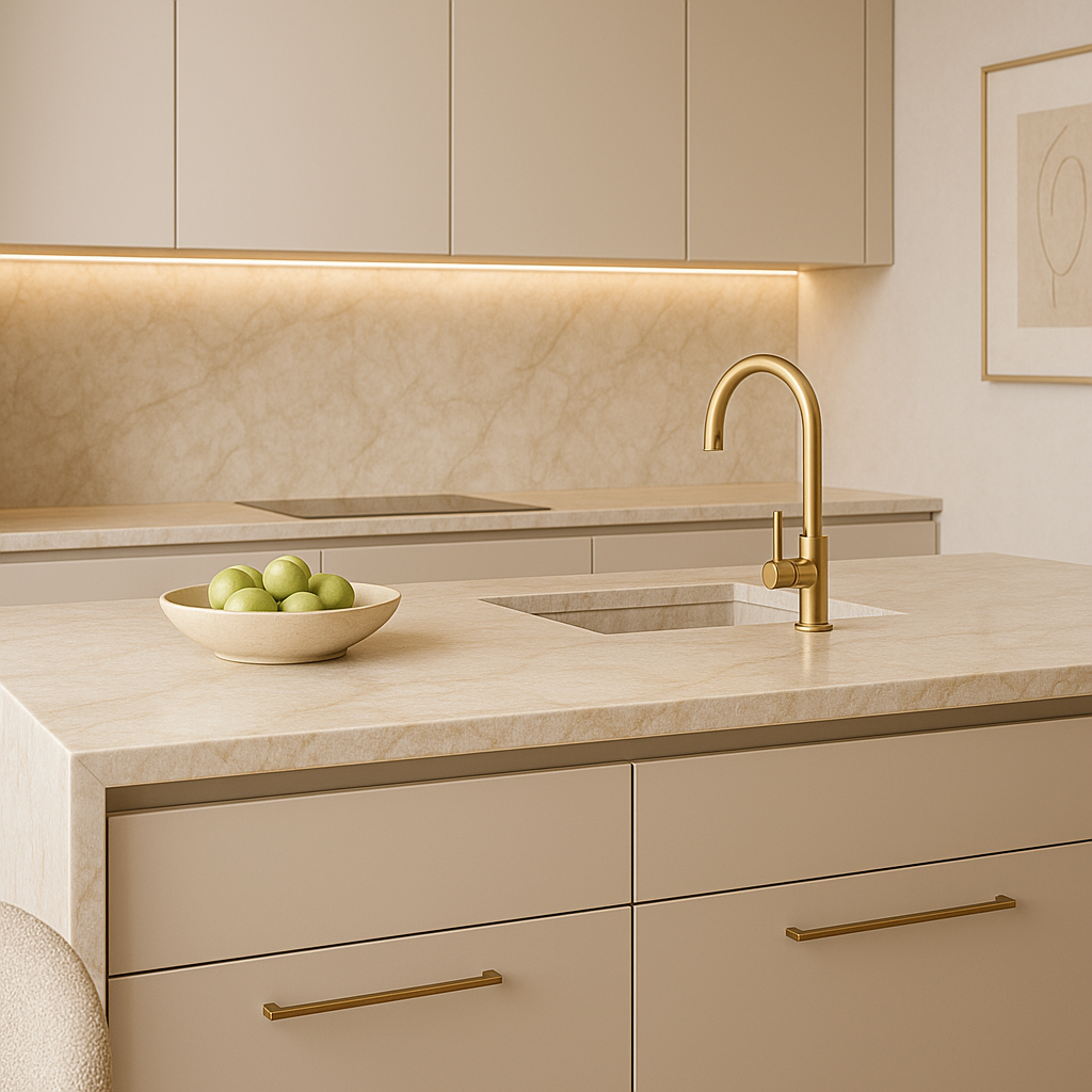Vernieuw en verrijk uw keuken met de tijdloze elegantie van onze Taj Mahal Porselein Satin keukenblad. Een duurzame porseleinen keukenblad dat luxe en warmte samenbrengt.